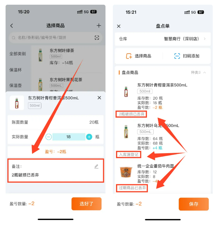 不管用哪种盘点方法,盘完后复盘才能进步。智慧记星火盘完货后能加【盈亏备注】,直接填漏登入库、包装坏了、客户退货没登记这些原因,系统会自动存着。时间长了,你能精准找到库存不一样的原因,优化流程少亏钱。