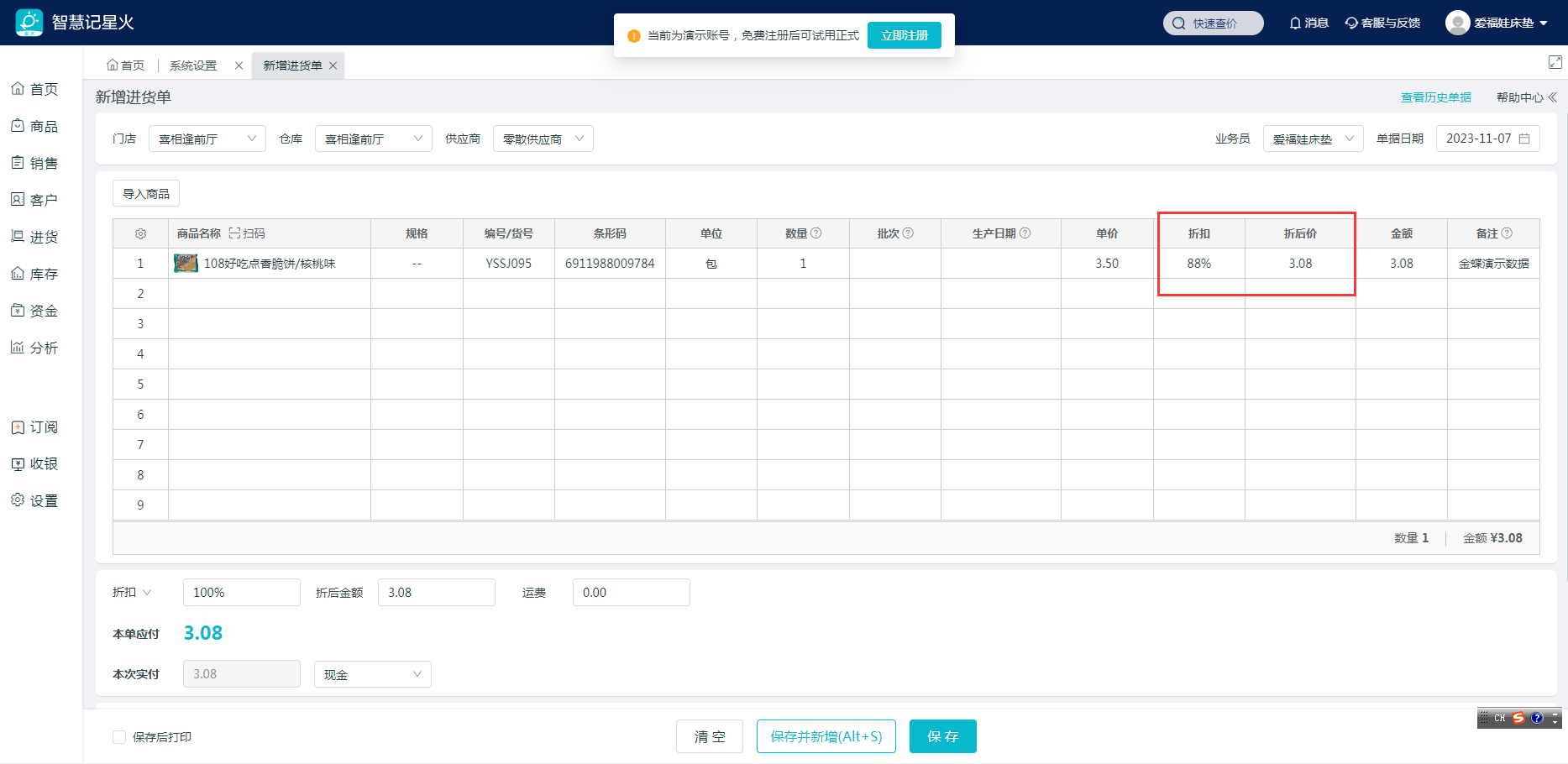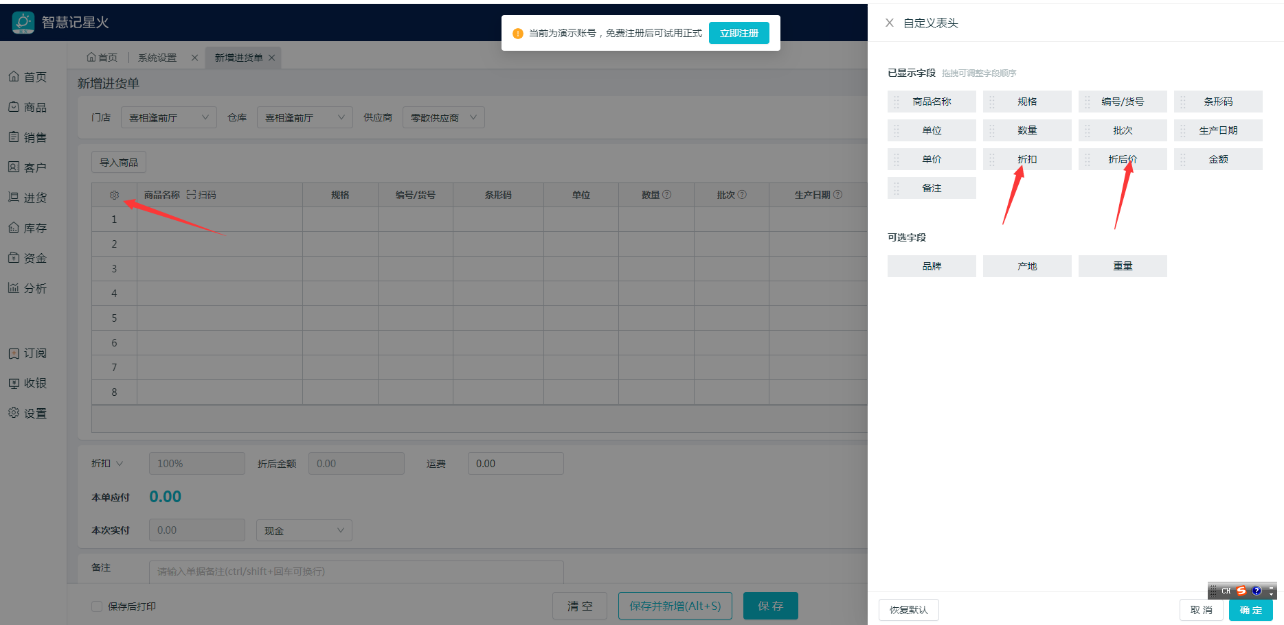 开启进货单单行折扣教程 操作路径:(1)设置-系统设置-勾选启用单行折扣。(2)进货-新增进货单-点击左侧设置按钮,把折扣,折后价添加到已显示字段里,然后点击确认。(3)开进货单即可输入单个商品的折扣率。