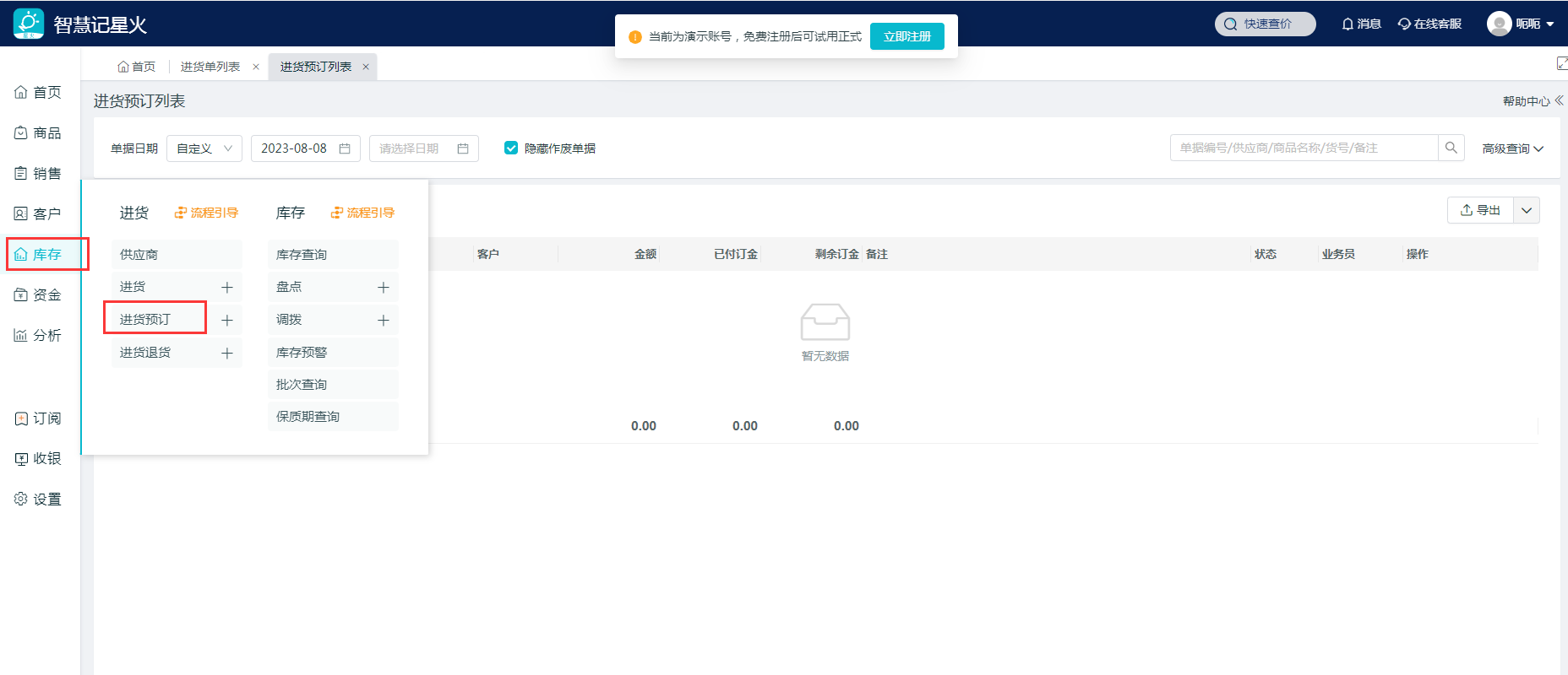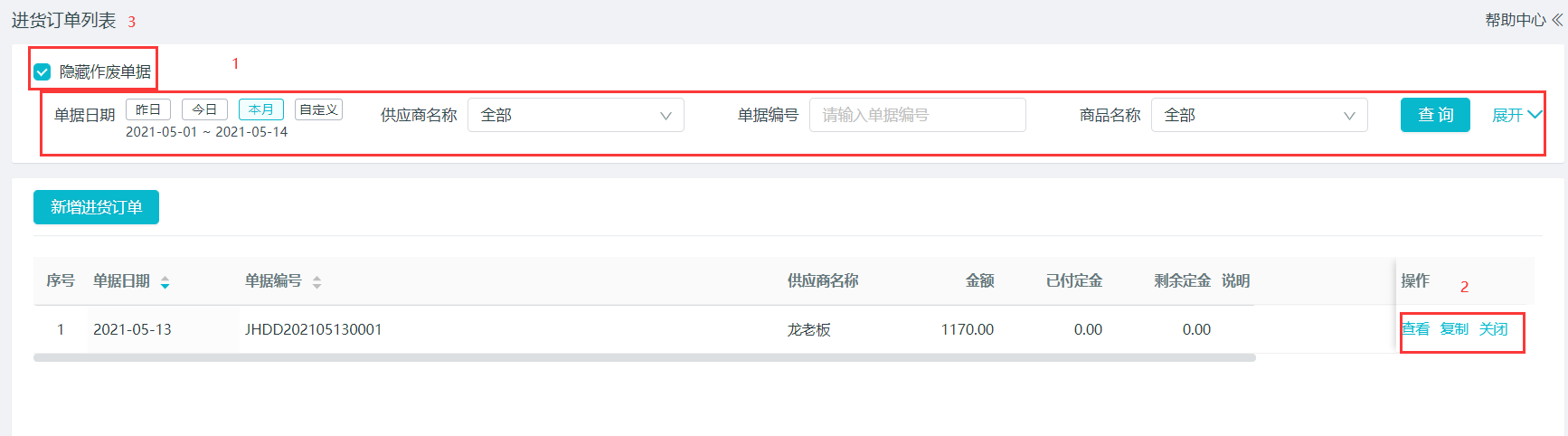 (3)关闭:关闭进货订单后,就无法转进货单。相当于作废该单据。